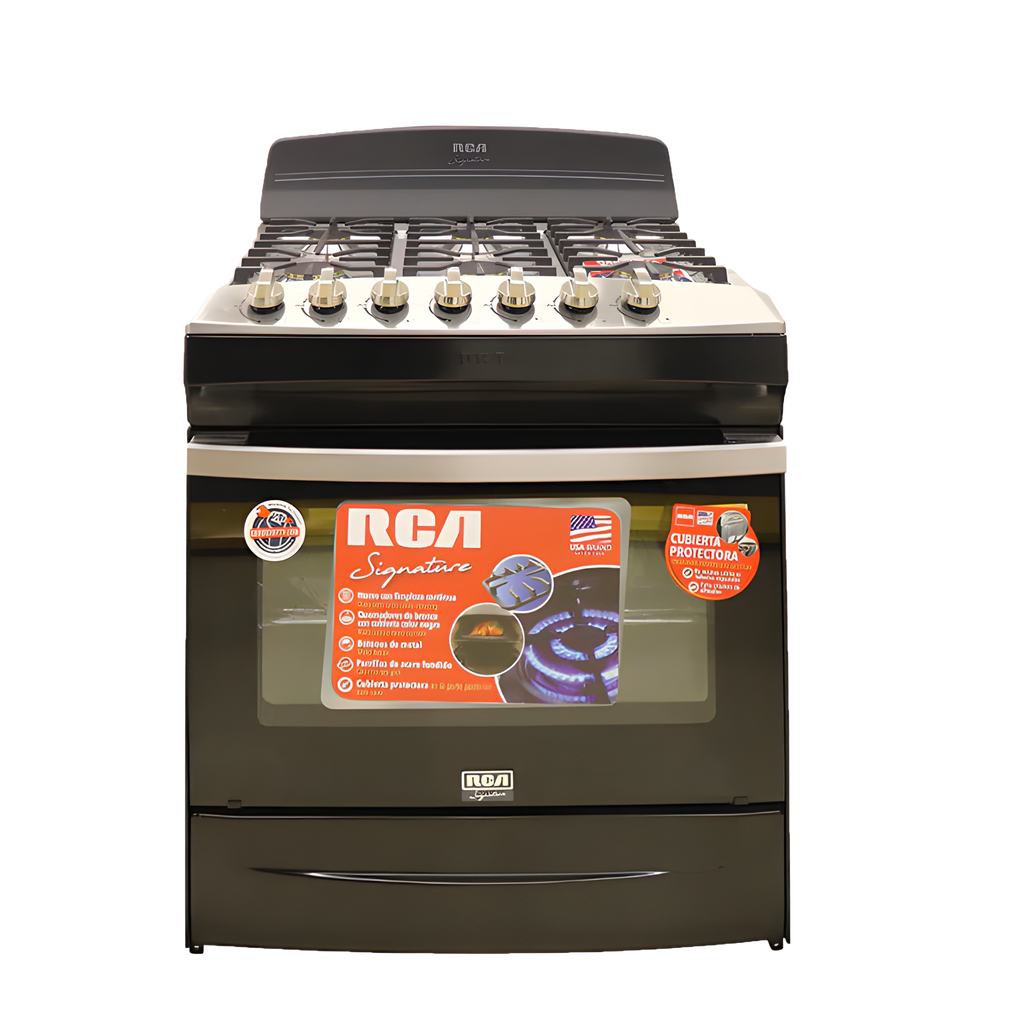 ESTUFA 30″ RCCR7603 NEGRO RCA6 quemadores de bronce negroParrillas de acero fundidoVidrio Panorámico en el HornoEstilo Moderno